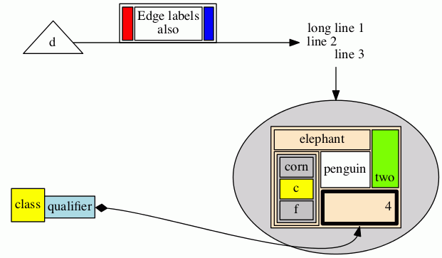 There is some inheritance among the attributes. If a table specifies a CELLPADDING, CELLBORDER or BORDER value, this value is used by the table's cells unless overridden. If a cell or table specifies a BGCOLOR, this will be the background color for all of its descendents. Of course, if a background or fill color is specified for the graph object owning the label, this will be the original background for the label. The object's fontname, fontcolor and fontsize attributes are the default for drawing text. These can be overridden by using FONT to set new values. The new font values will hold until overridden by an enclosed FONT element. Finally, the pencolor or color of the graph object will be used as the border color.